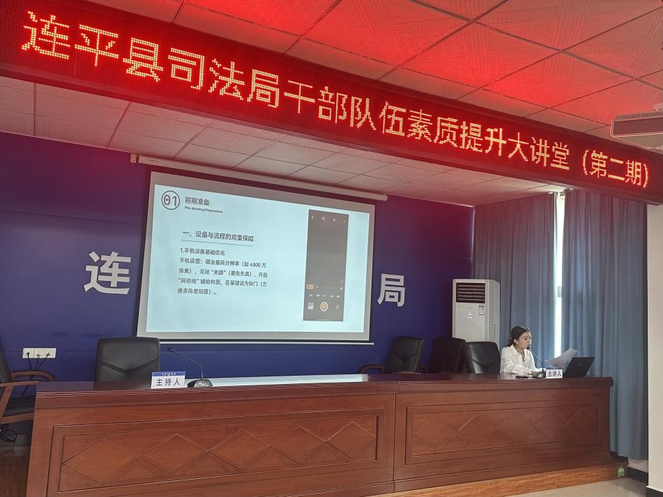 张晗茜同志以《摄影技巧实务》为题,为讲好司法行政故事,提升干部职工的摄影技术水平,从司法行政工作实际出发,围绕会议、培训、普法活动等场景重点讲解拍摄角度、构图选取、光影运用、参数调整等要点,同时讲解每类照片需要注意的事项,解析主体模糊、构图角度不佳、信息要素缺失等常见问题成因,授课过程中紧密结合个人作品和各类优秀工作照片赏析,以易懂、实用为导向,通过丰富的场景化案例直观呈现技巧应用,帮助干部职工掌握公务摄影规范技术,切实提升了干部职工的摄影技能。